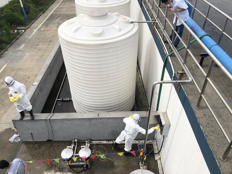 圖2:桐鄉(xiāng)申和水務(wù)有限公司總經(jīng)理沈建新演練現(xiàn)場(chǎng)發(fā)言 演習(xí)場(chǎng)地設(shè)置在三期冰醋酸加藥儲(chǔ)罐旁,某員工經(jīng)過儲(chǔ)罐旁時(shí)發(fā)現(xiàn)“冰醋酸”泄漏,污染地面。在初步查看后,第一時(shí)間按照程序向上級(jí)進(jìn)行匯報(bào)?傊笓]接到救援電話后,立即向各級(jí)應(yīng)急行動(dòng)組組長下達(dá)了應(yīng)急救援命令。各小組接到指示后,分工明確,響應(yīng)迅速。 綜合協(xié)調(diào)組立即在事故現(xiàn)場(chǎng)拉起了警戒線,組織疏散無關(guān)人員,確保事故處理線路通暢;物資調(diào)度組負(fù)責(zé)準(zhǔn)備、調(diào)集搶險(xiǎn)物資,第一時(shí)間將需要物資送往現(xiàn)場(chǎng);信息發(fā)布組負(fù)責(zé)將信息報(bào)告給相關(guān)部門,對(duì)網(wǎng)絡(luò)上的不實(shí)報(bào)道予以澄清;專業(yè)救援組身穿防化服到達(dá)現(xiàn)場(chǎng)后,進(jìn)入模擬區(qū)對(duì)冰醋酸儲(chǔ)罐泄漏點(diǎn)進(jìn)行封堵,將泄漏冰醋酸進(jìn)行有效收集,對(duì)圍堰地面進(jìn)行清洗;環(huán)境保護(hù)組及時(shí)關(guān)閉雨水井截止閥防止污染物流入雨水管,并對(duì)雨水管網(wǎng)進(jìn)行布點(diǎn)監(jiān)測(cè)。
