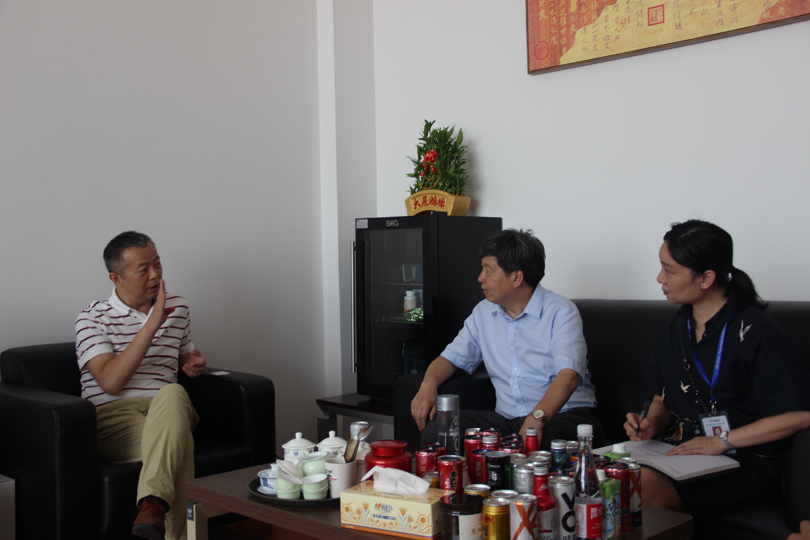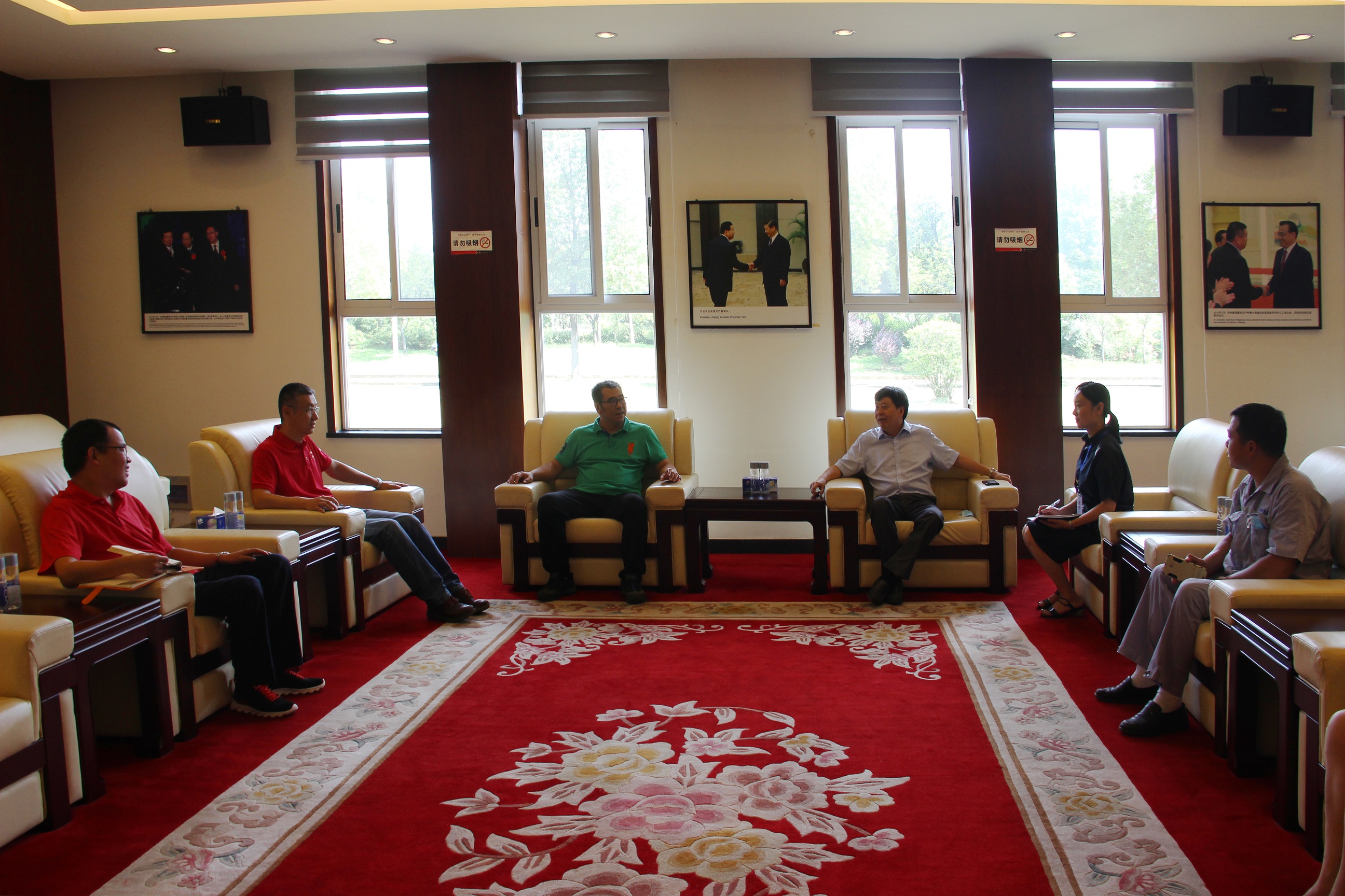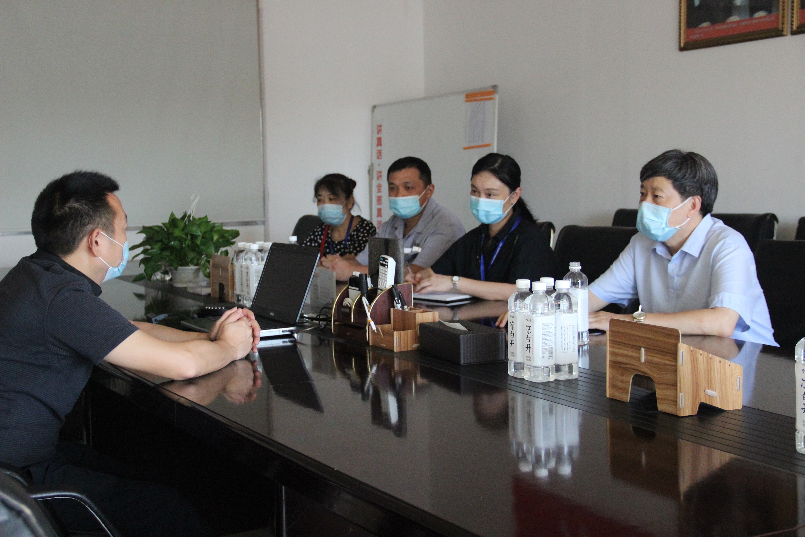 圖3:走訪奧瑞金企業(yè) 冒著炎炎烈日,毛總一行來(lái)到奧瑞金,與總經(jīng)理于仙超進(jìn)行了親切洽談。奧瑞金雖然是近幾年才落戶咸寧發(fā)展,但是作為一家飲料公司,對(duì)水質(zhì)的要求非常嚴(yán)格,值得欣喜的是咸寧聯(lián)合水務(wù)的水質(zhì)完全能滿足公司要求,無(wú)論是水量或是水壓,都可滿足平時(shí)生產(chǎn)需要。在談到對(duì)供水服務(wù)工作有何建議時(shí),于總說(shuō),企業(yè)的發(fā)展壯大并非一日之功,與聯(lián)合水務(wù)的合作非常愉快,希望聯(lián)合水務(wù)能持續(xù)保持現(xiàn)在的高標(biāo)準(zhǔn)、嚴(yán)要求的供水態(tài)度,為確保企業(yè)發(fā)展提供堅(jiān)實(shí)后盾。