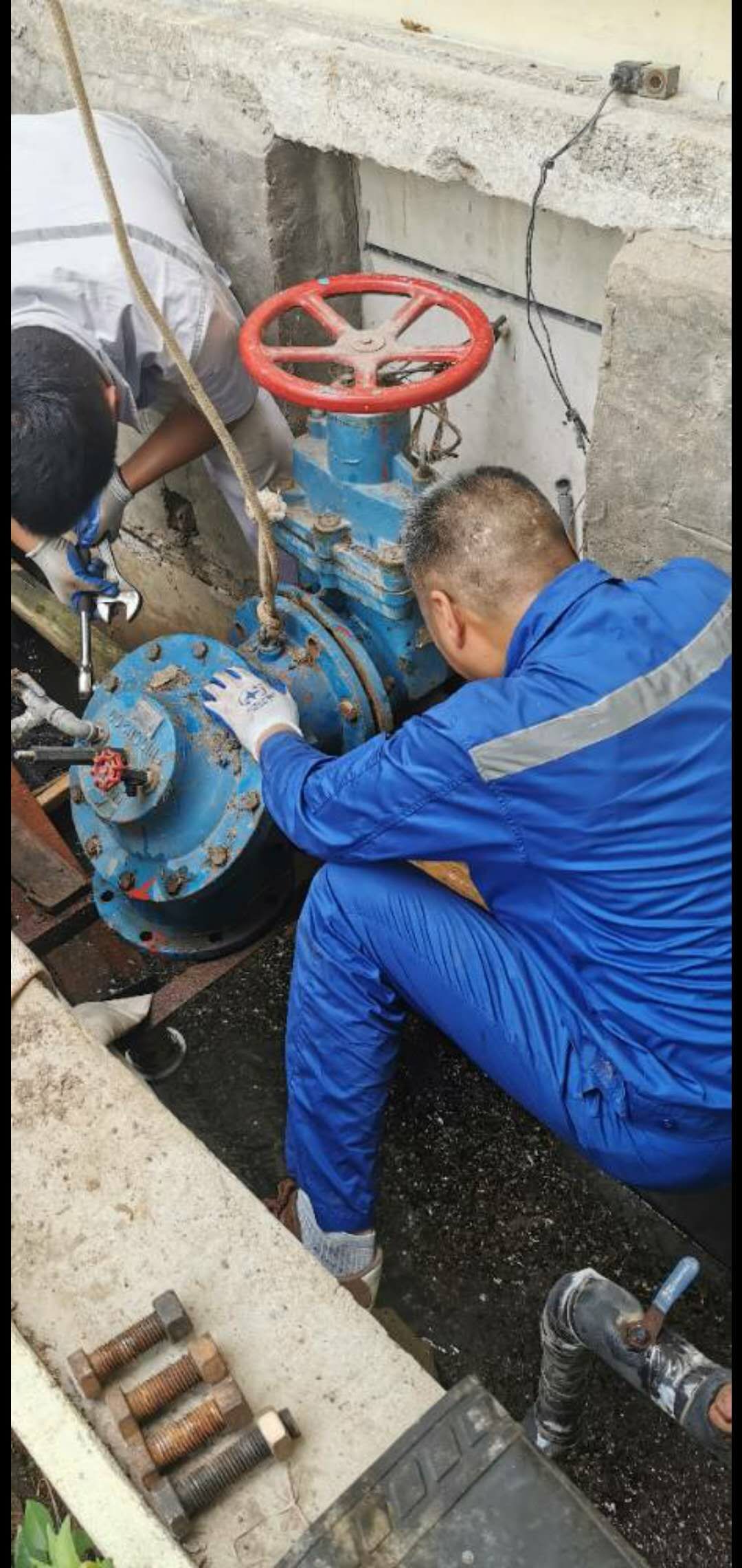 7月20日,接制水部反饋,一水廠4萬噸沉淀池出現(xiàn)排泥不暢情況。因為排泥直接影響到沉淀水的水質(zhì),所以機(jī)電部立即響應(yīng),組織相關(guān)人員開始研究方案,組織維修。