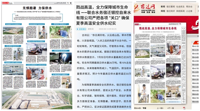 圖為《宿遷日?qǐng)?bào)》、“速新聞”、“宿遷網(wǎng)”刊登宣傳 制作高峰供水電視宣傳片,加深用戶直觀感受。今年的高峰供水宣傳增添了一大亮點(diǎn),即由地方電視臺(tái)節(jié)目組深入供水一線錄制、播出宣傳。經(jīng)過(guò)長(zhǎng)時(shí)間籌劃、宣傳片腳本的反復(fù)修訂、領(lǐng)導(dǎo)審核,歷時(shí)一個(gè)多月,公司高峰供水宣傳片在宿遷綜合頻道、公共頻道播出,引起了很大反響。電視節(jié)目的播出,將供水的工作場(chǎng)景直觀展現(xiàn)在用戶面前,充分體現(xiàn)了供水人不畏酷暑、力保供水的可貴精神,獲得社會(huì)高度認(rèn)可。