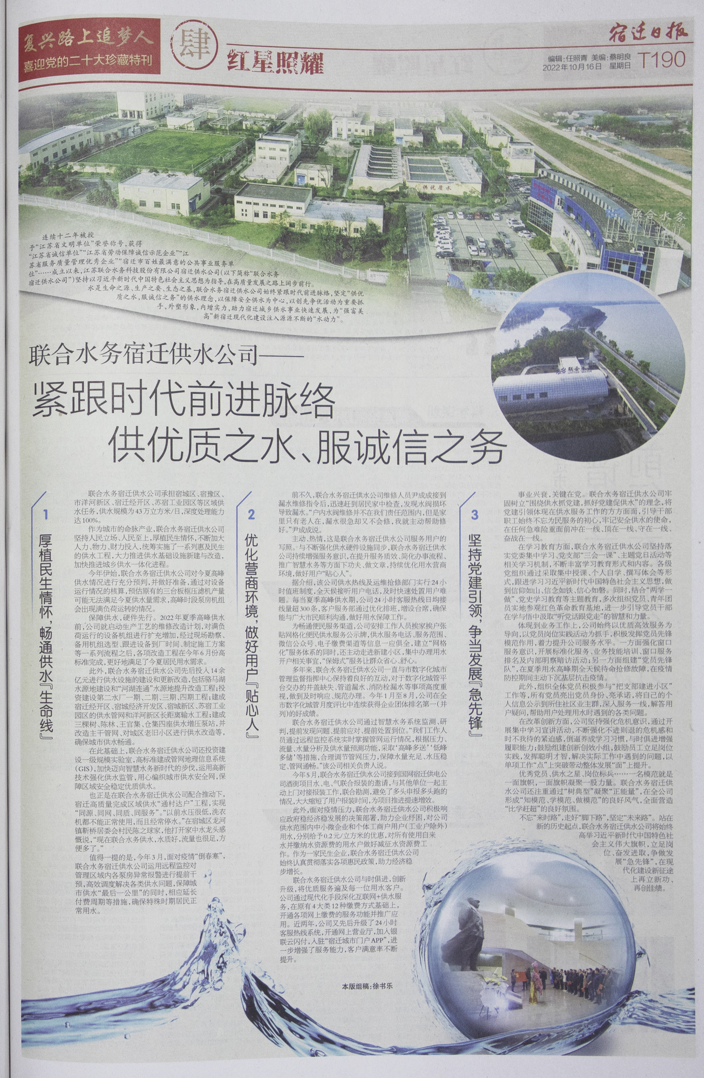 | 江蘇聯(lián)合水務科技股份有限公司榮登宿遷日報社喜迎黨的二十大珍藏特刊 | ||