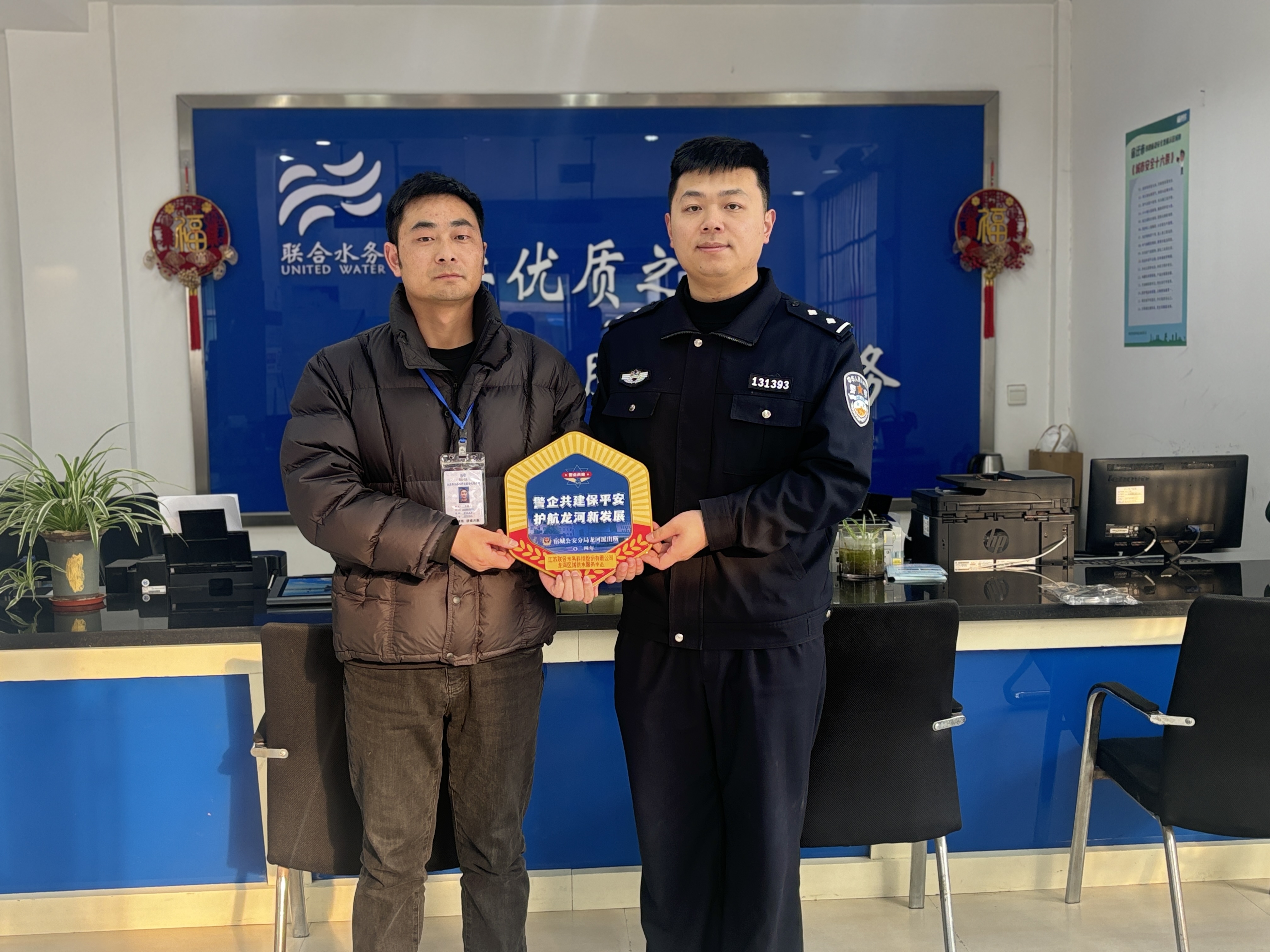 近日,宿城公安分局龍河派出所向龍河區(qū)域供水服務中心頒發(fā)了“警企共建保平安、護航龍河新發(fā)展”牌匾。這不僅警企之間的緊密合作的象征,更是對聯(lián)合水務努力維護地區(qū)安全與穩(wěn)定、推動地區(qū)經濟發(fā)展的高度肯定。