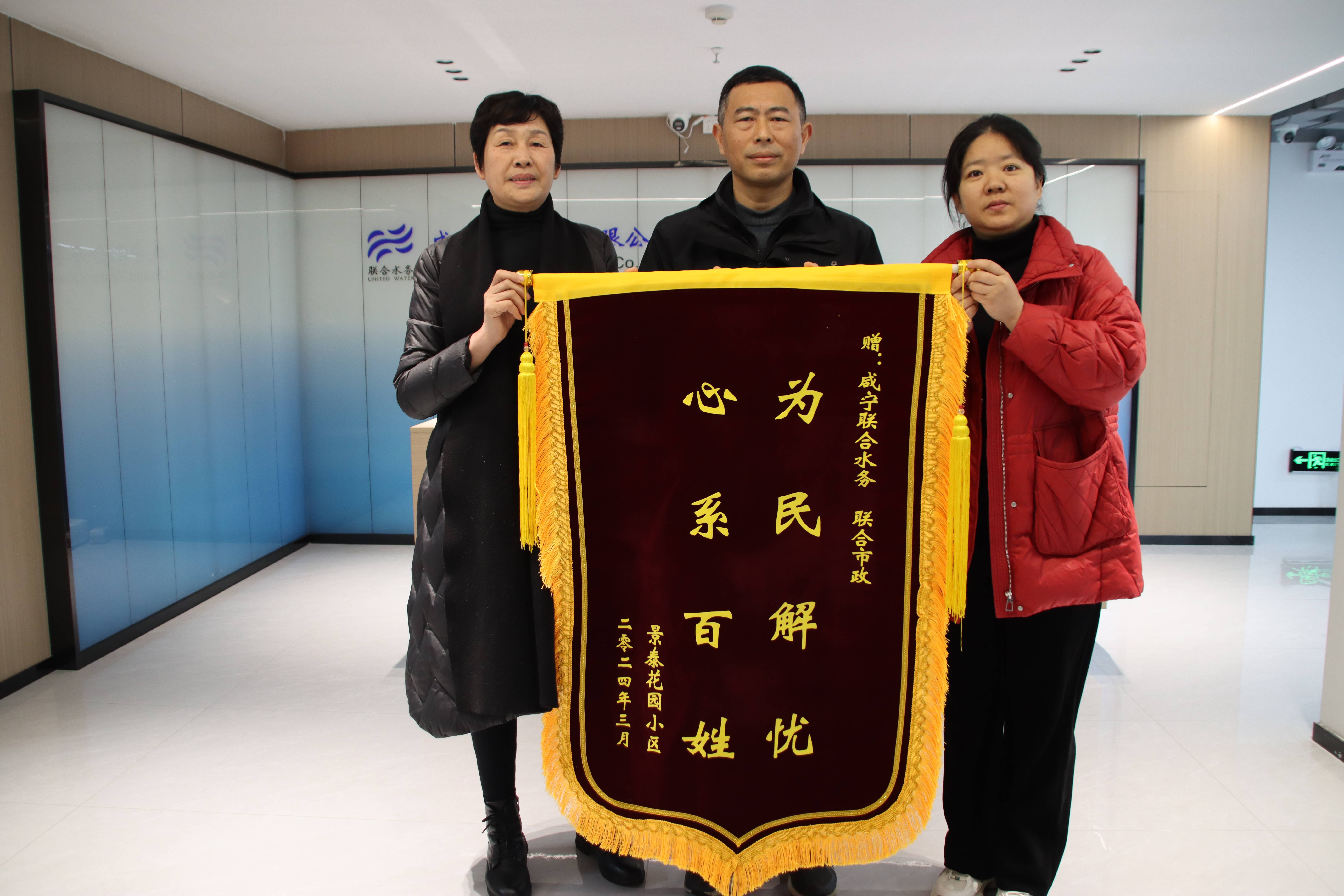 3月18日上午,湖北省咸安區(qū)景泰花園小區(qū)物業(yè)代表?xiàng)钆考皹I(yè)主代表專程將一面印著“為民解憂、心系百姓”的錦旗送到聯(lián)合水務(wù)集團(tuán)運(yùn)營管理中心管網(wǎng)總監(jiān)兼咸寧區(qū)域管網(wǎng)副總經(jīng)理夏維龍手中,對咸寧聯(lián)合水務(wù)有限公司、咸寧聯(lián)合市政工程有限公司積極上門服務(wù)、熱情解決居民實(shí)際用水問題表示感謝。
