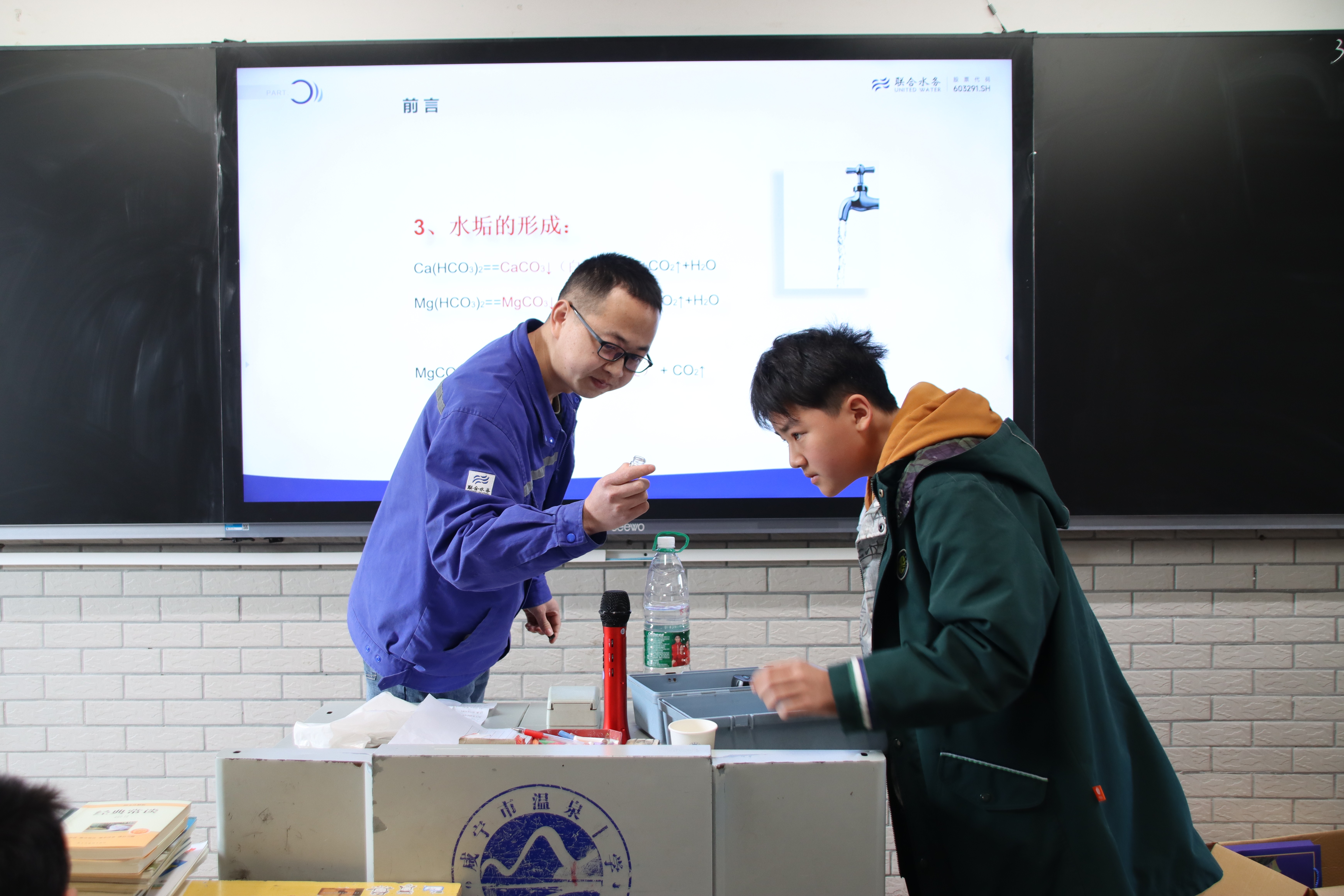 活動(dòng)現(xiàn)場(chǎng),咸寧聯(lián)合水務(wù)工作人員向?qū)W生們生動(dòng)地講述了“自來(lái)水的形成、制水工藝流程、出廠(chǎng)水質(zhì)量控制標(biāo)準(zhǔn)”等水知識(shí),“世界水日是什么時(shí)候?”“自來(lái)水是自來(lái)的嗎?”現(xiàn)場(chǎng)以寓教于樂(lè)、以問(wèn)促學(xué)的互動(dòng)方式進(jìn)一步加深了學(xué)生對(duì)“一滴水的旅程”的了解,學(xué)生們一邊認(rèn)真做筆記,一邊積極互動(dòng),爭(zhēng)先恐后搶答問(wèn)題,活動(dòng)現(xiàn)場(chǎng)熱鬧非凡。為更好的向?qū)W生科普水質(zhì)檢測(cè)方法和生活飲用水用水標(biāo)準(zhǔn),公司水檢中心工作人員還攜帶相關(guān)設(shè)備,通過(guò)邀請(qǐng)“幸運(yùn)觀(guān)眾”的方式,開(kāi)展“渾濁度檢測(cè)”和“混凝”實(shí)驗(yàn),讓師生們近距離感受水的奇趣變化,使節(jié)水護(hù)水觀(guān)念進(jìn)一步深入人心。