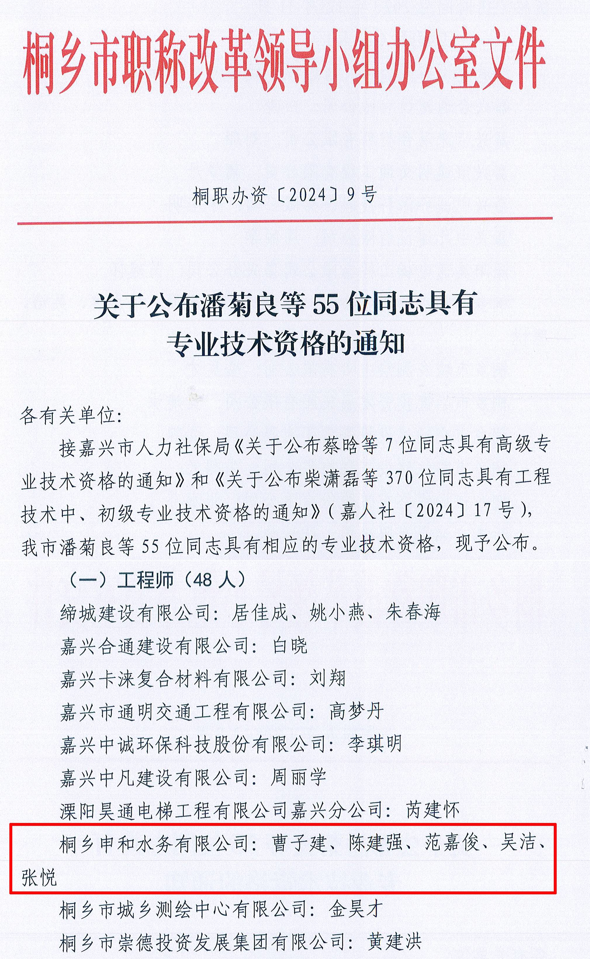 近日,桐鄉(xiāng)申和水務有限公司曹子建、陳建強、范嘉俊、吳潔、張悅5名員工一同順利通過嘉興市工程技術(shù)中級專業(yè)技術(shù)資格評審委員會評審及認定,成功獲得生態(tài)環(huán)境監(jiān)測與分析專業(yè)中級工程師職稱。