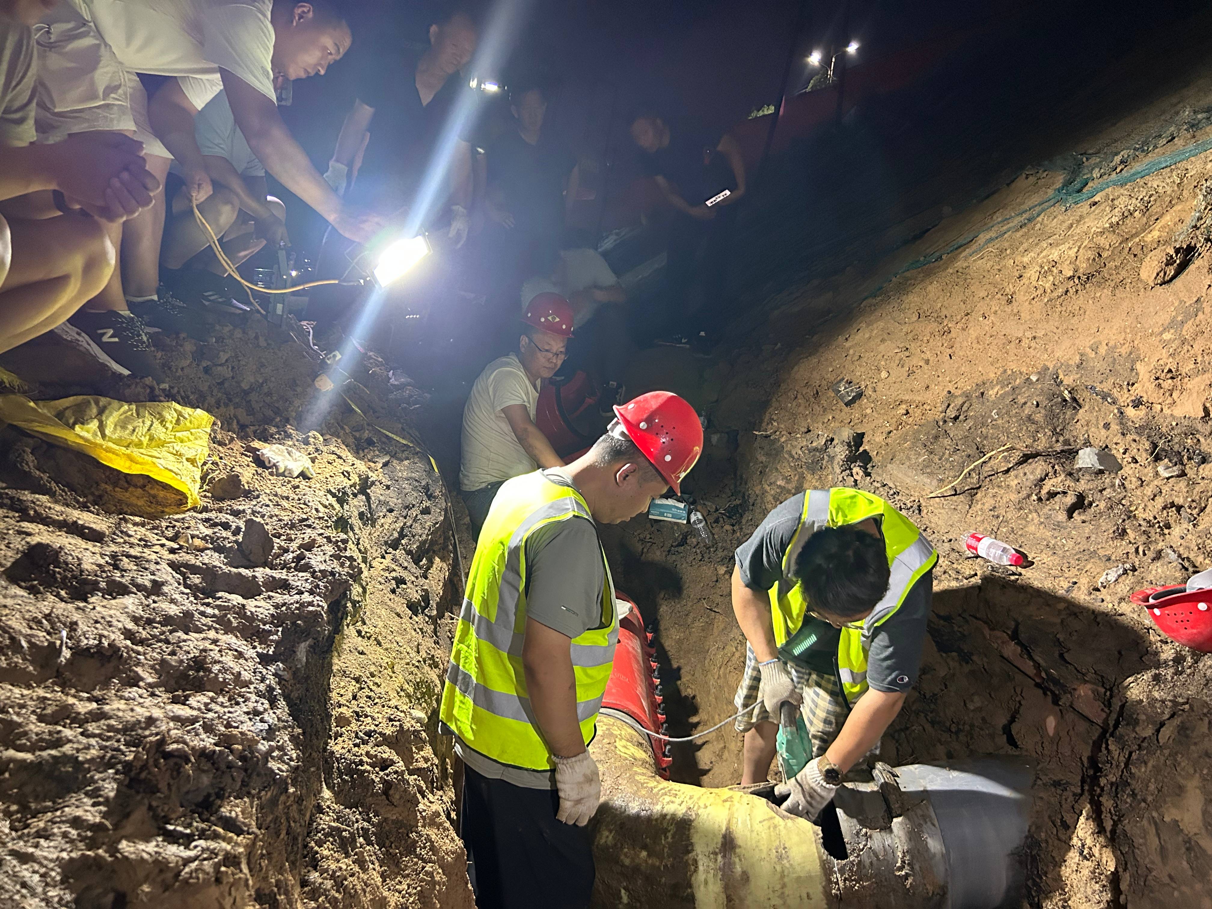 搶修現(xiàn)場,燈火通明,數(shù)十名搶修人員身穿反光背心,頭戴安全帽,在緊張的氛圍中忙碌著。他們分工明確,有續(xù)的關(guān)閥門、開挖、找漏點(diǎn)、排水一道道工序有條不紊地鋪開,時間一分一秒過去,但搶修人員的腳步從未停歇,他們深知每一秒的延遲都意味著市民的等待與不便。在緊張的搶修過程中,大家齊心協(xié)力,客服重重困難,展現(xiàn)水務(wù)人勇于擔(dān)當(dāng)、無私奉獻(xiàn)的精神風(fēng)貌。他們顧不上汗水浸濕衣袖,在布滿泥水的狹小空間中進(jìn)行維修作業(yè)。經(jīng)過近8個小時的全力奮戰(zhàn),7月26日凌晨3時10分,破損管線基本修復(fù)完畢,縣城區(qū)域逐步恢復(fù)供水。