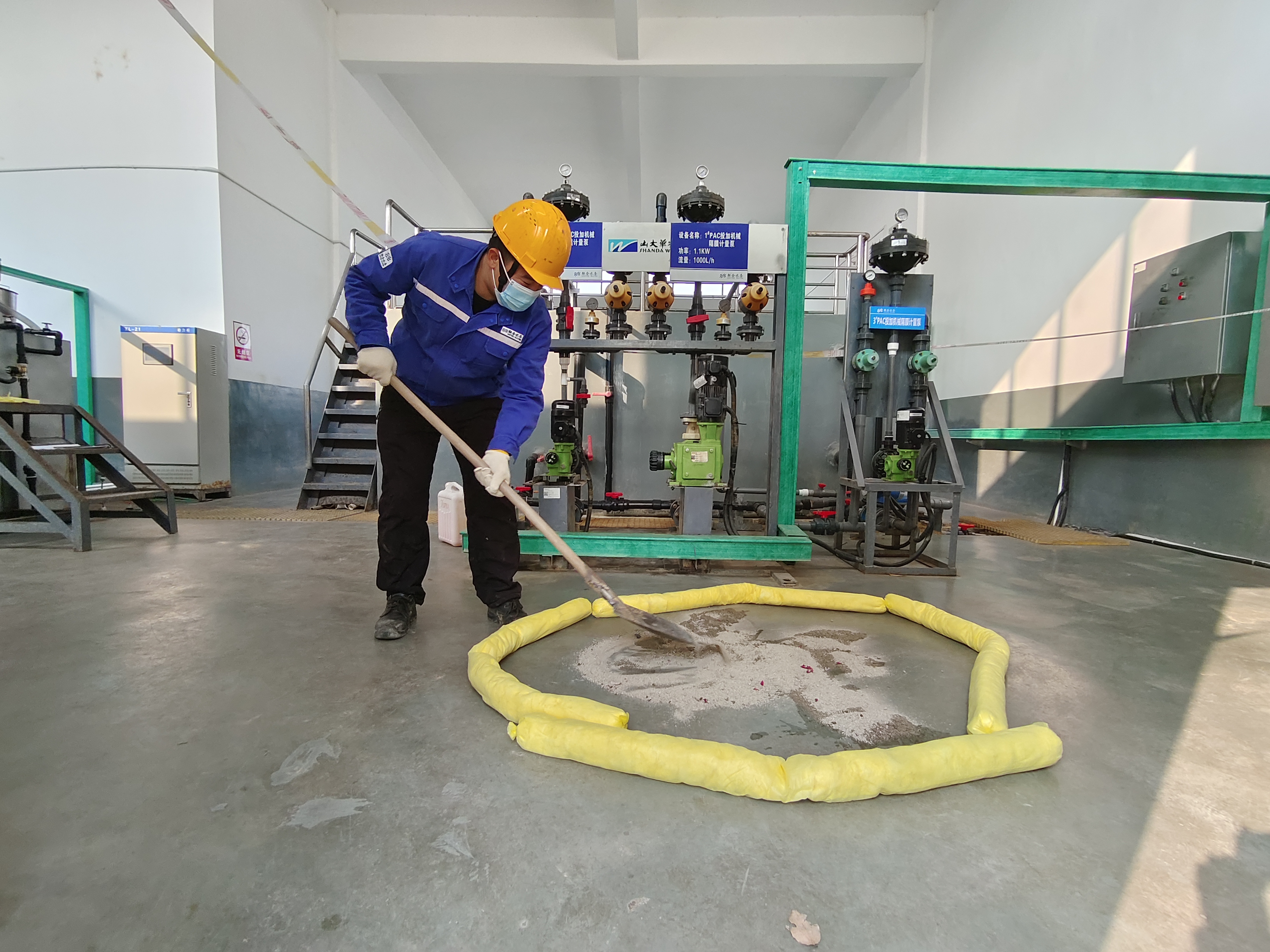 演練初始,化驗(yàn)員在轉(zhuǎn)移廢液的過程中,模擬由于應(yīng)急處置措施執(zhí)行不當(dāng),導(dǎo)致廢液不慎傾倒并發(fā)生泄漏。桶內(nèi)的廢液迅速在PAC加藥間地面蔓延開來,存在對(duì)環(huán)境造成進(jìn)一步污染的風(fēng)險(xiǎn)。面對(duì)這一緊急情況,隨行的化驗(yàn)人員迅速采取行動(dòng),立即向上級(jí)部門主管匯報(bào)了事故情況。主管在接到報(bào)告后,沒有片刻遲疑,立即向組長(zhǎng)報(bào)告,并且在第一時(shí)間啟動(dòng)了應(yīng)急預(yù)案,以期最大限度地減少對(duì)環(huán)境的影響。
