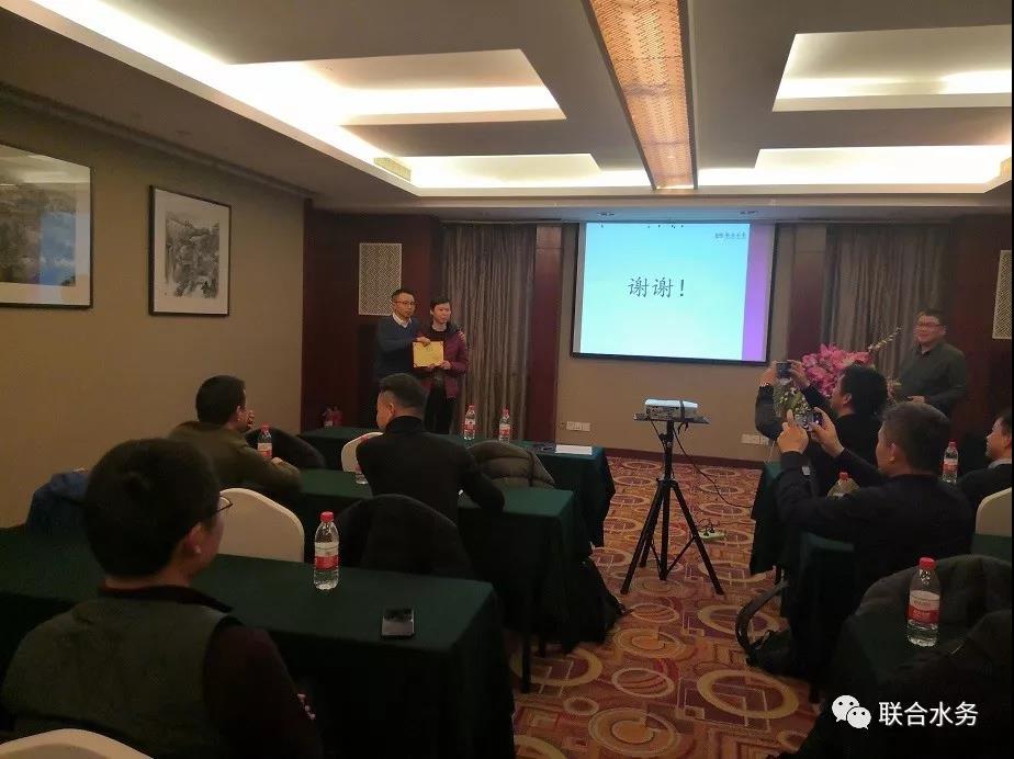 圖3:聯(lián)合水務(wù)集團(tuán)高級副總裁陳樵先生為老員工頒獎 總部來的4位領(lǐng)導(dǎo)依次發(fā)言,最后陳總就此次會議作了總結(jié)發(fā)言。首先陳總表揚(yáng)了各部門主管的發(fā)言,肯定了各部門的辛勤付出,陳總感謝大家為公司所作的貢獻(xiàn),也指出了2019年的不足之處。陳總希望大家在2020年一起努力,做好安全生產(chǎn)、達(dá)標(biāo)穩(wěn)定運(yùn)行、水量水費(fèi)能更好地完成預(yù)算,對申和水務(wù)2020年的發(fā)展給予了更高的期望。陳總還為大家送上新年賀詞,祝大家新年快樂!萬事如意!闔家歡樂!