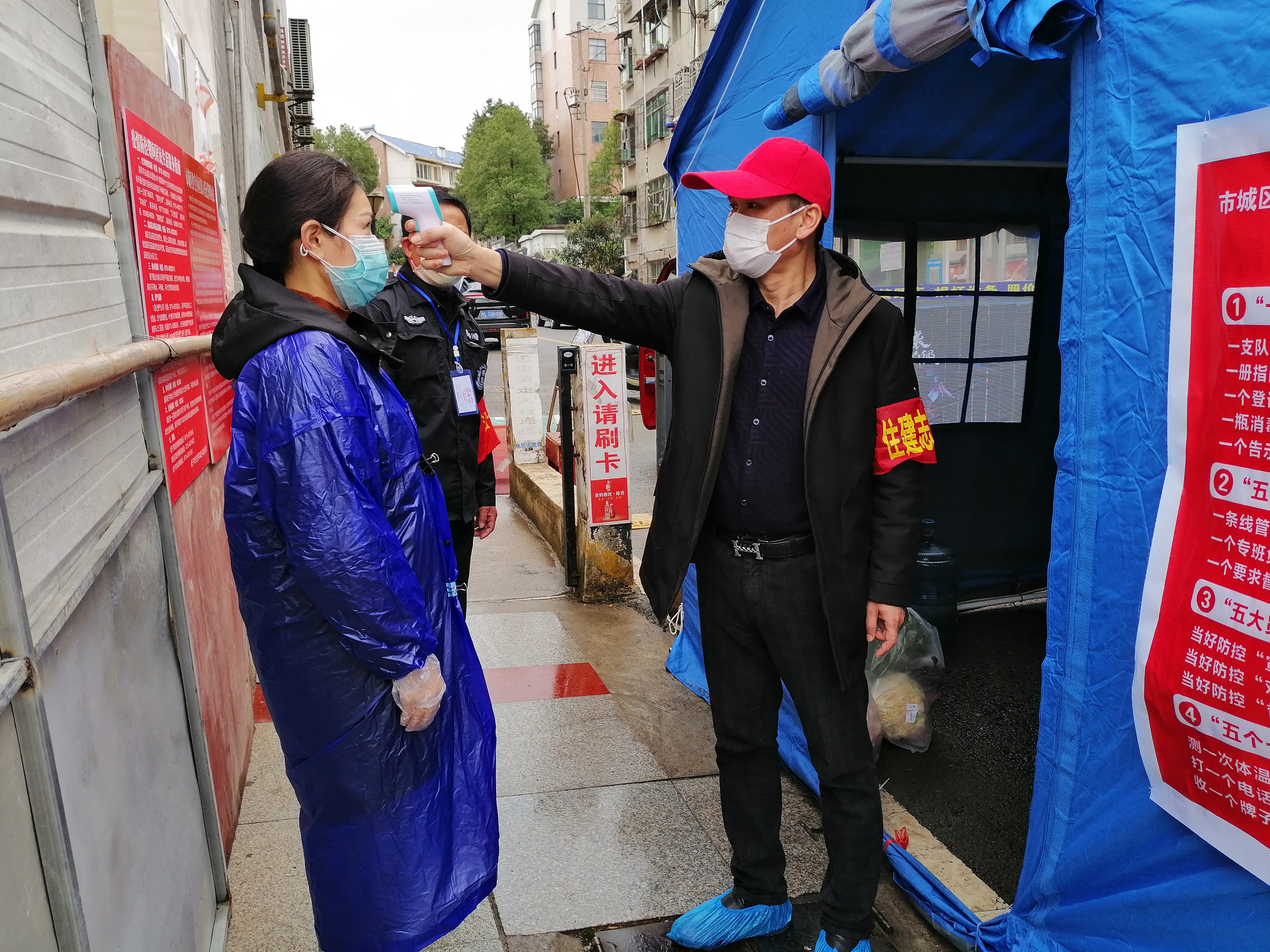 圖1:志愿者徐武勇給出行人員測量體溫 在防控疫情這場沒有硝煙的戰(zhàn)斗中,每位黨員都是一面鮮紅的旗幟。有著13年黨齡的徐武勇同志是公司黨總支委員兼人事行政黨支部書記,在接到市住建局黨組發(fā)動(dòng)的志愿者號召后,他連夜從三十公里外的鄉(xiāng)下驅(qū)車趕到城區(qū),主動(dòng)請纓帶領(lǐng)公司黨總支所屬的4個(gè)黨支部20多名黨員,參加各小區(qū)疫情防控工作。目前,徐武勇同志已在水榭花都小區(qū)連續(xù)值守5天,每天工作時(shí)間長達(dá)13個(gè)小時(shí)。該小區(qū)有801戶,共2000多名居民,除了配合和督促小區(qū)物業(yè)做好居民外出登記、檢測體溫,對小區(qū)進(jìn)二次噴藥消殺外,還負(fù)責(zé)居民所需米、面、油、肉蛋奶、蔬菜等基本生活必需品的代購送貨,以及重點(diǎn)管控人員排查,嚴(yán)格落實(shí)對重點(diǎn)人員“2分1測1戴”。面對繁重的工作任務(wù),徐武勇同志說:“作為一名黨員,為守護(hù)大家的安全出一份力是應(yīng)該的,大家一起努力,一定會(huì)很快打贏這場防疫攻堅(jiān)戰(zhàn)”。 為筑牢小區(qū)防控戰(zhàn)線,聯(lián)合水務(wù)黨員志愿者嚴(yán)格按照市住建局黨組進(jìn)駐各物業(yè)小區(qū)的工作要求,落實(shí)“十個(gè)一”配置、實(shí)行“五個(gè)一”管理,做好“五個(gè)一”工作。
