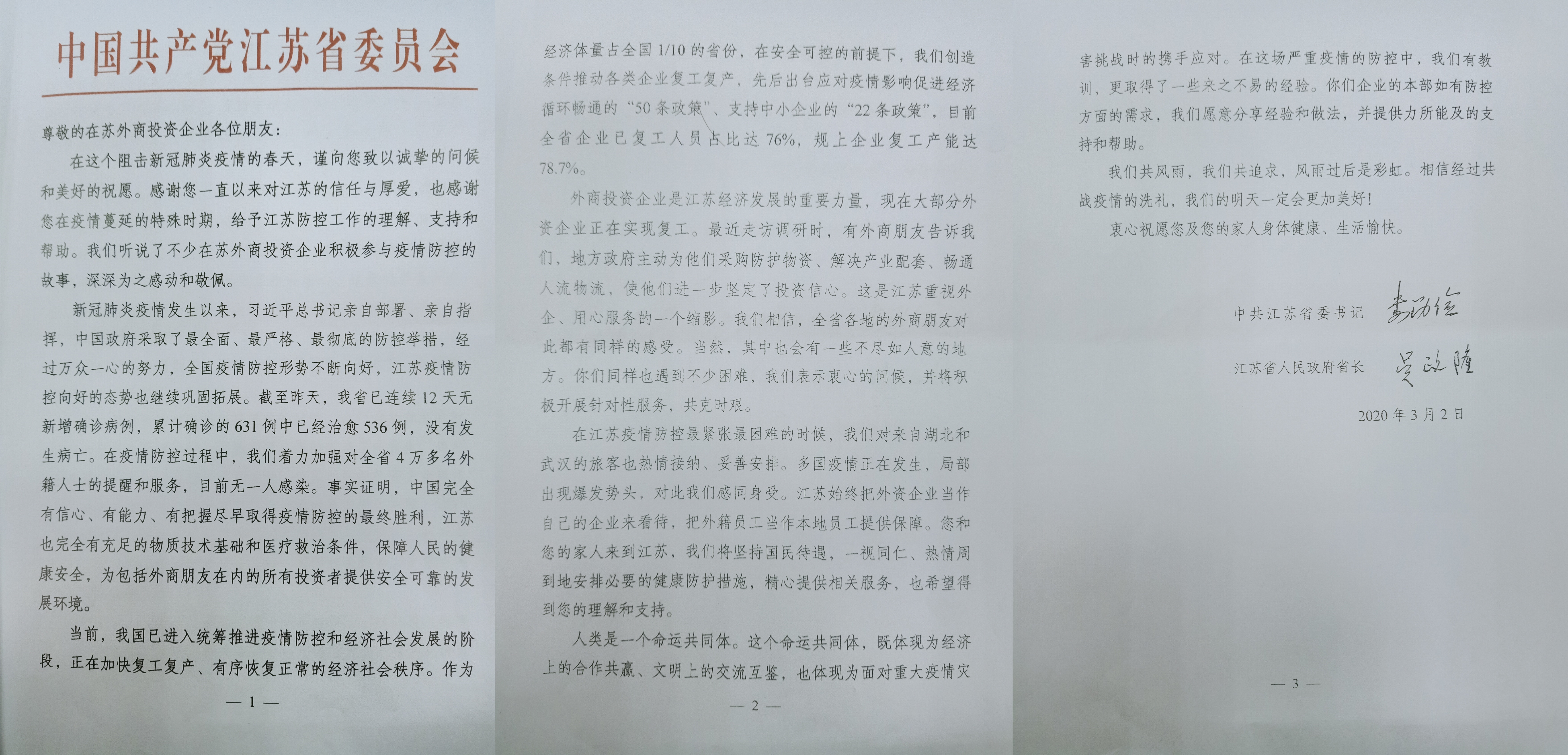 江蘇省歷來重視來蘇投資企業(yè)、用心服務(wù),宿遷市一直致力于營造全省最佳營商環(huán)境。聯(lián)合水務(wù)集團(tuán)宿遷銀控自來水有限根植江蘇宿遷16年來,累計投資達(dá)12億元以上,用于城市供水事業(yè)投資建設(shè)。面對疫情,我們無所畏懼,將會繼續(xù)扎實推進(jìn)企業(yè)發(fā)展,助推宿遷社會經(jīng)濟(jì)快速發(fā)展。一封“鴻雁傳書”,彰顯了政府的關(guān)懷,讓我們投資企業(yè)更加堅定信心,攜手共克時艱,同心齊創(chuàng)未來。我們同樣堅信:風(fēng)雨過后是彩虹,明天定會更美好!