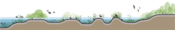 備注:水生植物對氮和有機質的去除機制 魚蝦螺貝等水生動物也是修復過程中必不可少的一環(huán)。其凈化機理分為直接和間接兩種:一、水生動物通過攝食水體中有機懸浮物、藻類及植物腐敗殘體等方式,直接削減水體中富營養(yǎng)物質;二、水生動物通過攝食或其分泌物的天然絮凝作用,提高水體透明度,增強沉水植物光合作用,間接促進植物對水體的凈化效果。 棲息地營造與恢復也是水生態(tài)修復的重要目的。通過微地形營造及草-灌木-喬木小生境的設計,可有效實現生物多樣性的恢復及棲息地的打造。如涉禽類主要于水深10-23 cm的空間內活動攝食,而游禽類主要于水深50-200 cm范圍內游憩活動,水深30 cm范圍內覓食,而不同的植被可為其提供產卵、棲息的隱蔽空間。