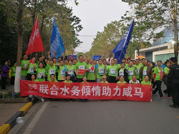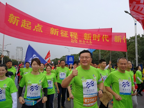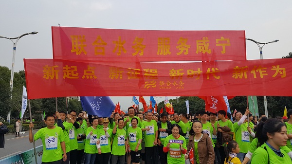 11月11日上午8點,2017年咸寧國際溫泉馬拉松賽在咸寧市人民廣場鳴槍開跑,本次活動吸引了全世界的1.2萬人參加,聯(lián)合水務(wù)集團副總裁劉猛、陳樵、James Beeson先生及旗下6個項目公司的63名參賽隊員匯集香城泉都,代表聯(lián)合水務(wù)傾情助力本次馬拉松大賽。 當(dāng)天7:20,集團63名參賽人員和咸寧公司70名啦啦隊和服務(wù)人員,在起點人民廣場集中,高舉“新起點、新征程、新時代、新作為”、“聯(lián)合水務(wù),服務(wù)咸寧”的橫幅,大家步伐整齊,揮舞彩旗,方陣格外引人注目,為本屆馬拉松賽事增添了一抹亮麗的風(fēng)景。