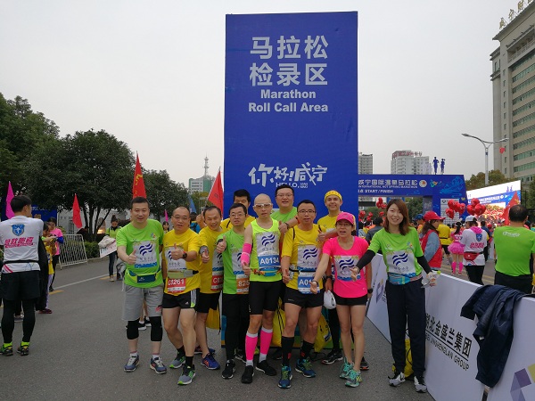 (圖3:微型馬拉松隊員合影) 集團副總裁劉猛先生帶領(lǐng)集團46名微型馬拉松隊員,甩開膀子、大步向前沖刺,賽道上大家不甘落后,互相鼓勵,以堅韌不拔、永不言棄的精神,超越自我極限,跑向終點,咸寧聯(lián)合水務(wù)羅志祥獲得了聯(lián)合水務(wù)微馬參賽人員第一名。 集團副總裁陳樵、James Beeson先生帶領(lǐng)17名全程、半程馬拉松隊員經(jīng)過1至3個多小時的激烈角逐,全部抵達終點。集團人事行政總監(jiān)楊麗霞是唯一跑全馬的女性,她以超人的毅力,鍥而不舍的精神跑完全程。新絳縣晉華生態(tài)環(huán)境工程有限公司總經(jīng)理夏學(xué)春和瑞昌市金達萊環(huán)保有限公司梅琳分別獲得聯(lián)合水務(wù)參賽人員半程和全程馬拉松第一名。集團領(lǐng)導(dǎo)分別為微型、半程和全程馬拉松獲獎運動員頒發(fā)了獎金。
